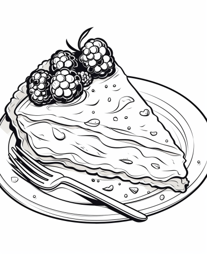 Dessert coloring page for kids, depicting a slice of pie on a plate, black and white, clear image, no text, cartoon style, clear outlines, low detail, no color, no shadow --ar 9:11