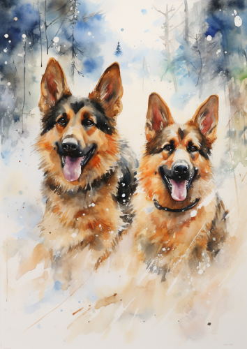 watercolor painting of german shepherds playing in abstract winter wonderland --ar 5:7 --seed 1000