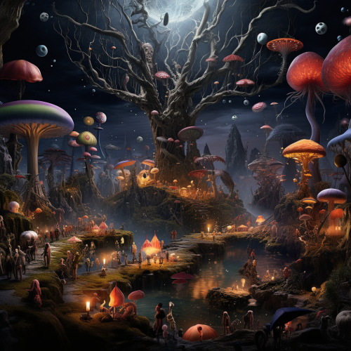 A festive New Years Party in a dark mushroom forest with dangling tendrils. Dancing guests are wearing animal masks. There is a cake on the table. There are colorful balloons all around. There is a string of very very large balloons which say "2024". Behind there is an erupting stratovolcano. --ar 1:1