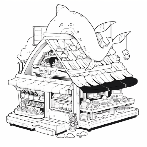 hand drawn, coloring book style, black and white, soft lines, cell shaded, cute, scene of sushi shop with chini anime style shark making sushi rolls --niji 5