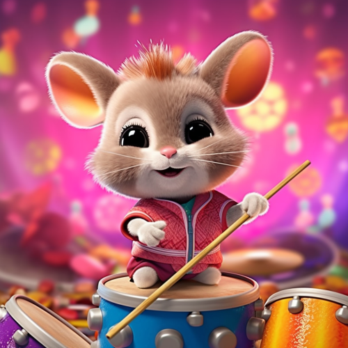Clay animation style,drums,colorful cute baby mouse with big eyeballs,beat the drum of a musical instrument,cute facial expressions,colorful background --v 5.2