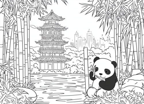 panda sat in front of a wooden Pagoda set in a bamboo forest eating bamboo sticks and has a japanese city in the background, designed as a detailed coloring page. Kawaii style. The scene is black and white and thick bold lines, perfect for coloring. --ar 11:8