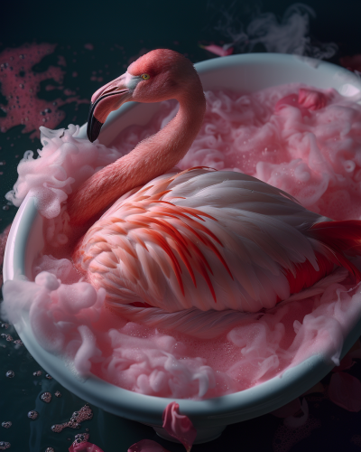 A top view of an antique white bathtub ,a beautiful pink flamingo inside, sleeping, filled with water and filled with pink foam, dramatic lighting, smoke, hasselblad --ar 4:5 --s 250 --v 6.0 --style raw
