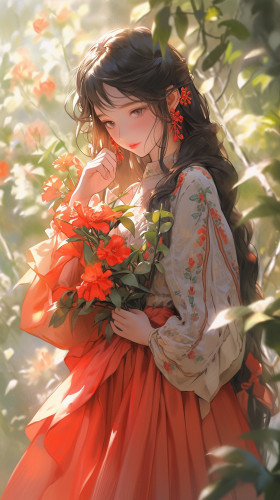 Ancient Style Girl, Scattered Flowers, Lively and Cute, Flower Background --niji 5 --aspect 9:16 --relax