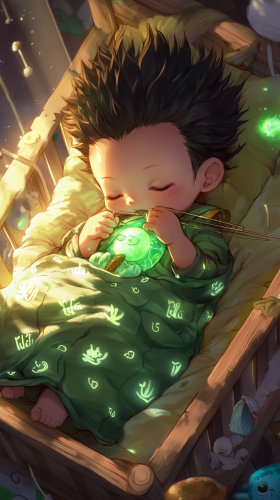 Baby Gon from Hunter x Hunter in an ultra-cute 'uwu' style, peacefully sleeping in a small wooden crib, wrapped in a soft green blanket with tiny Hunter Exam symbols. His chubby cheeks are blushing, and he has a gentle glow of Nen energy surrounding him like a protective aura. In the crib, he holds a tiny fishing rod, reminiscent of his adventures. The crib is surrounded by small plush toys shaped like Hunter x Hunter items, with pastel colors creating a warm, cozy atmosphere. 8K, HDR, high quality, --ar 9:16