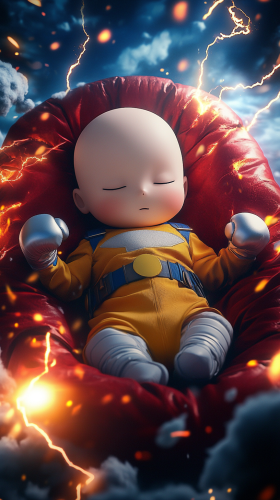 Ultra cute baby Saitama with his usual blank expression, lying in a cradle shaped like a giant boxing glove, decorated with superhero motifs and surrounded by uwu-style lightning bolts and comic explosions. He's holding a plush Genos or a punching bag plush, all in a soft, adorable style. 8K, HDR, high quality, --ar 9:16