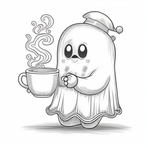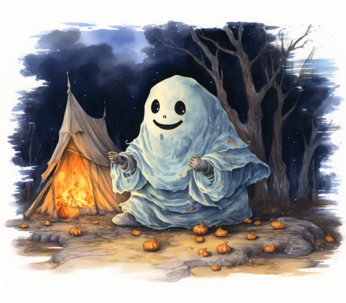Cute sheet ghost playing guitar at a campfire