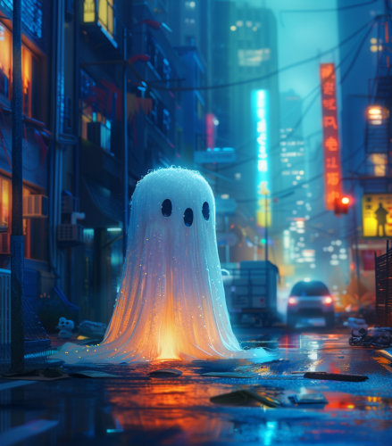 cute ghost lost in big cities, in the style of charming character illustrations --ar 7:8 --s 250 --v 6.0