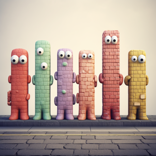 a flat illustration of a series of tall and narrow cartoon octopus characters made up of bricks , different in shape, different colours, --v 5.2