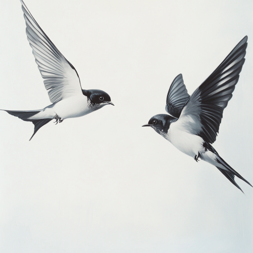 realistic set of swallow birds flying with each other, they are suspended in the air, with a clear white sky behind them, painted by raphael or michalengelo, realistic oil painting,