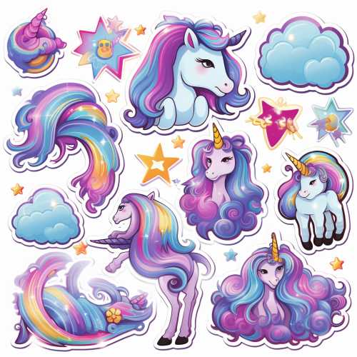 Bundle of Charming Unicorn Stickers: Main Focus: A collection of adorable unicorns in different poses, each exuding a playful and endearing demeanor. The unicorns can be depicted with colorful manes and tails, expressive eyes, and whimsical features that make them appealing to a younger audience. Secondary Elements: Include accompanying elements such as stars, hearts, rainbows, and flowers. Scatter these elements around the unicorns to enhance the magical and enchanting atmosphere. Color Palette: Soft Pastel Tones: Light pinks, purples, and blues Vibrant Accents: Rainbow colors, including yellow, green, blue, and pink Ensure that the image prompt captures the essence of the unicorn stickers' charm and playfulness, incorporating a variety of expressive poses and accompanying elements. This will help in generating a diverse and engaging set of unicorn stickers for young enthusiasts.