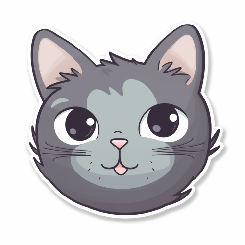 Die-cut sticker, cute kawaii all-grey cat with white lips above its mouth and a white spot above its left eye, on a white background, designed with minimalism in vector format and pastel colors. --v 5.0