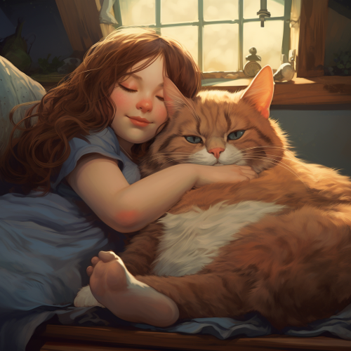 a giant anthropomorphic tabby cat with a tiny chubby girl curled up asleep in its lap --s 50