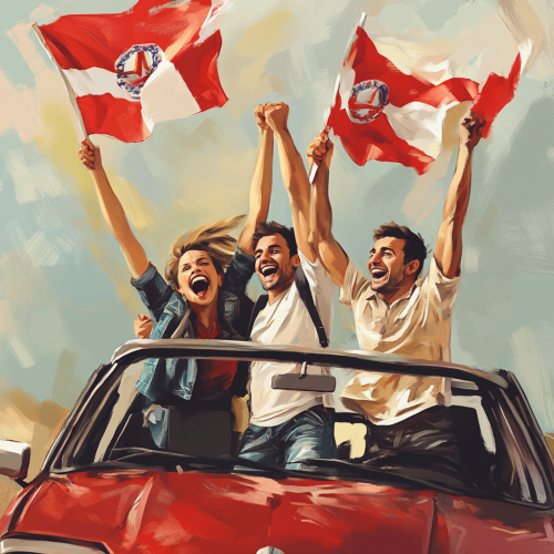 3 people coming out from the car, with Georgian flags in their hands, celebrating their football team winning the championship. they look so happy. it needs to be illustrated and realistic, also simple so I can edit it