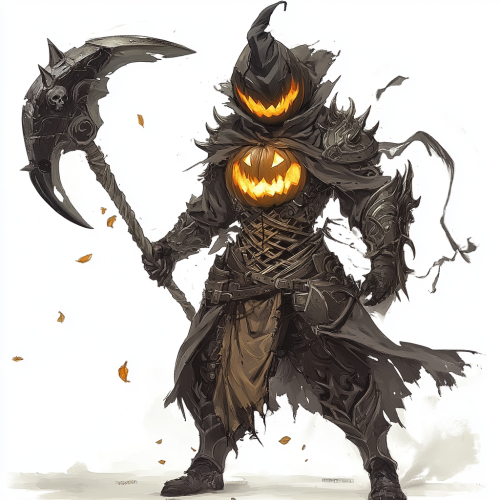 Japanese anime style, white background, character design, Monster Hunter armor, standing image style, Magyur series, lattice torso like the Wicker Man, a human spirit trapped in the torso, pumpkin-like armor on the limbs and face, a person wearing a black hood and cloak, holding a scythe like the Grim Reaper