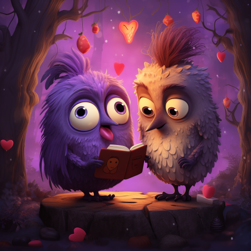 These little monster characters may have the shape of birds, but they are anything but ordinary. The male monster has a mischievous look on his face as he reads from a notepad to the female monster, who is completely captivated by his words. With hearts in her eyes, she eagerly writes down her phone number for him, creating a charming and unique scene.