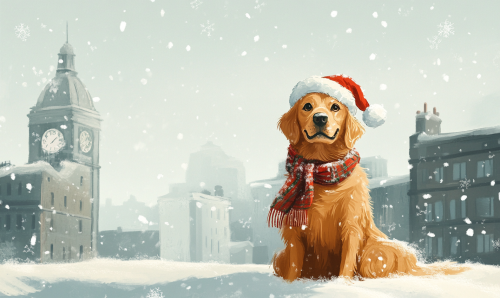 illustration of a happy Golden Retriever sitting in front of the Taj Mahal with sunglasses and a Santa hat on , drawn in the style of Oliver Jeffers, soft light, pastel colors, Christmas theme, childrens book illustation --ar 5:3 --v 6.1