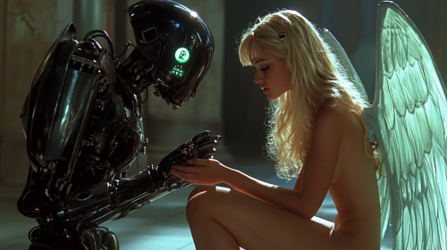 Stanley Kubrick, Eyes Wide Shut, occult mysticism beautiful cyber angel girl with blonde hair and wings. She is talking to a black and seafoam green robot machine. Legs and skin showing --ar 16:9 --style raw --v 6.1