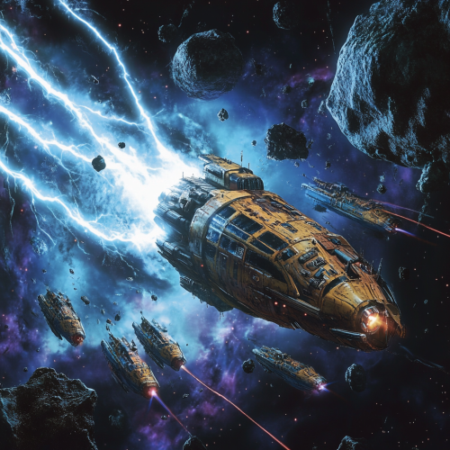 a medium sized pirate spaceship exploding outward with an large electrical EMP pulse while this ship is surrounded in space by 10 other pirate ships with asteroids in the background. those ships are engulfed by this EMP pulse.