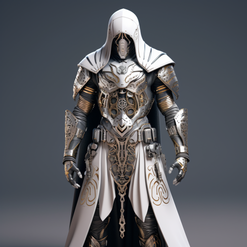 full body futuristic cyber armor based on traditional Arab clothing, with futuristic cyber weapons based on traditional Arab weapons