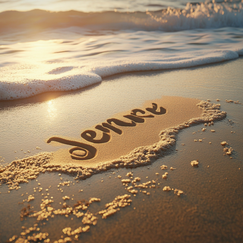 A soft, dreamy visual of the name Jenny written in the sand on a beach, with gentle waves lapping at the edges. The scene is peaceful, with the sun setting in the background, casting a warm glow over the serene landscape. The image should evoke feelings of tranquility, nostalgia, and natural beauty, as if capturing a timeless moment. Art Style: Photorealism, Soft-Toned, Tranquil