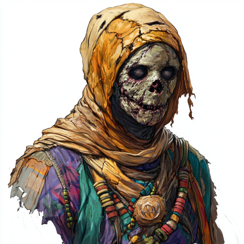 in a painted style with intricate detail show a cheerful undead figure named Ankh-Seneb, wearing a cracked and weathered clay mask that reveals over half his face. Dressed in colorful, mismatched, tattered robes and bright accessories, exuding optimism. The image is captured with the nuanced precision of a Canon EOS R5 mirrorless camera and a versatile RF 24-70mm f/2.8L IS USM lens. The figure is rendered with artistic finesse. The camera captures this scene at an aperture of f/7.1, ISO 400, and a shutter speed of 1/60 sec, ensuring every last detail is faithfully reproduced. The camera is positioned at a mid-high level angle, with diffused lighting softly illuminating the figure , enhancing the textures and hues of the robes and mask against the pristine white background. D&D npc