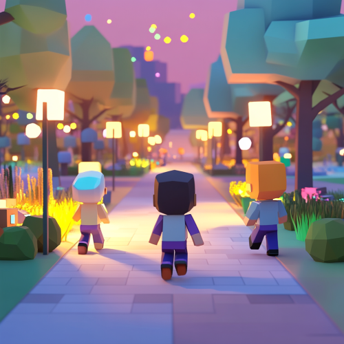 KIPPO style mobile app game with low poly blocks. Main character is in the center of image walking towards a park with other players conversing. The game is block by block based with colorful lighting.