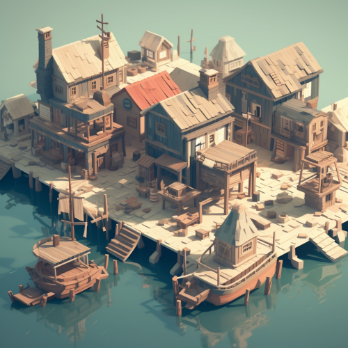 low poly port village with docking for boats in the style of ashley wood --s 750 --v 5.0
