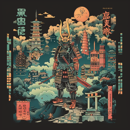child soldier with a gun in his hand in a samurai mask on the background of a ruined city, in the Japanese zame smkoki bamboo, clouds bright colors, graffiti t-shir design --v 6.0