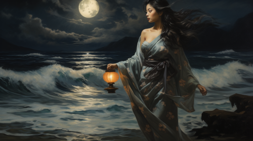 |time period: 18th century |subject: Beautiful Japanese woman in traditional clothes staring at ocean holding small lantern up in left hand |Medium: Oil Painting |Environment: Ocean Shore Storm Large Waves Night |Lighting: Dark |Color:Vibrant |Mood: Worried |Composition:Landscape --seed 0424 --ar 16:9