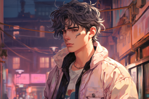 80s anime still, male cyberpunk protagonist handsome short hair, retro fashion, muted pastel colors, by Tsukasa Hojo and Toshihiro Kawamoto --ar 3:2