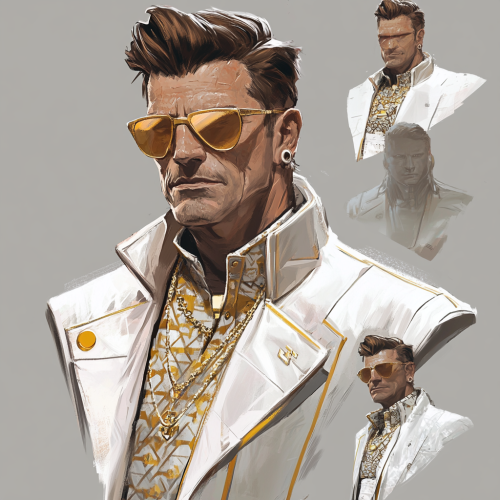 Concept art of Cyberpunk Mafia captain, clean-shaven with brown hair in a pompadour, large nose, and futuristic golden aviator sunglasses. He is in his 30's, and wears a new-age white leather coat with a high collar, over a patterned gold-and-white designer shirt, with a gold chain necklace around his neck. Portrait view, multiple sides. Blade Runner aesthetic, flashy character, dark gritty style, Gomorra Italia aesthetic, Cyberpunk futuristic setting, --v 6.1