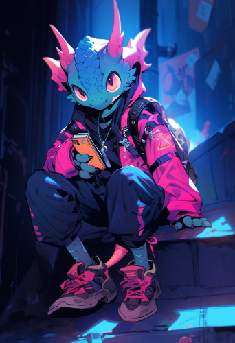 little cartoon boy dragon with blue and pink, cyberpunk manga style, Dane Yoon, Joram Rooks, street fashion, rtx on, comic art, neon colors, post-conceptual --ar 58:85 --niji 5