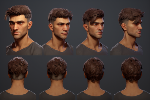 30 year old male with very short hair, headshot, 3D model character sheet, character turnaround, character reference sheet, neutral expression, --ar 3:2