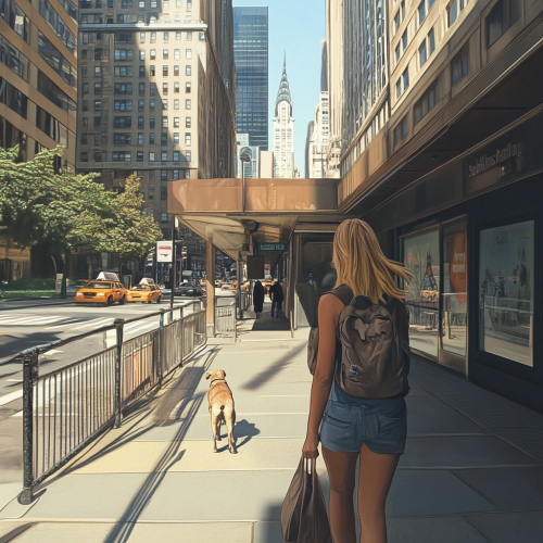 POV sidewalk. Go pro. artwork rockstar games, artwork of gta 5, cel shading, cel art. Subway station entrance in midtown Manhattan. Homeless guy begging on corner. Woman walking her dog. Pedestrians walking around. Daytime