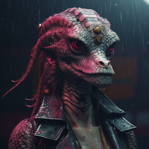 feminine snake head, scaly skin, gritty cyberpunk, rain, 70s film aesthetic, guitar on back