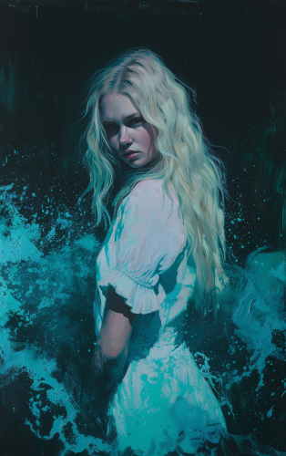 cyberpunk, oil painting Illustration of a young blonde powerful person standing, vary ethnicity, wearing white preppy victorian modern clothes, Muckbang neon. Sea foam and throth oozing out from the background darkness, fibonacci, , style of mona lisa. Oil painting, portrait, muted tones, light azure highlights, azure blue, green, black. --ar 5:8 --v 6.0 --s 50