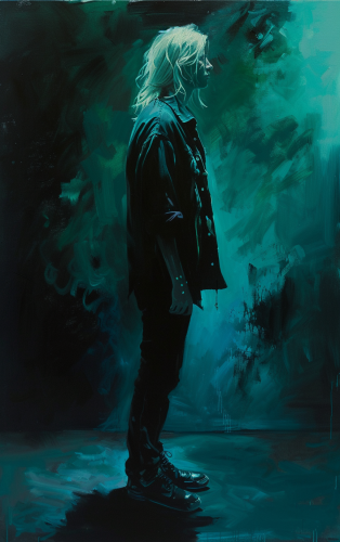 cyberpunk, oil painting Illustration of a young blonde powerful person standing, wearing white preppy victorian clothes, Muckbang neon. Sea foam and throth oozing out from the background darkness, fibonacci, , style of mona lisa. Oil painting, portrait, muted tones, light azure highlights, azure blue, green, black. --ar 5:8 --v 6.0 --s 50