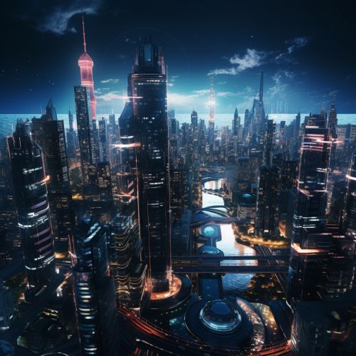 epic aerial shot of futuristic cyberpunk New York City, aspect 7:4