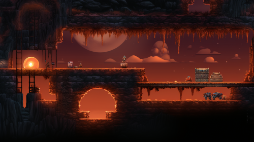 dark orange cavern side scrolling platformer 8 bit colours with 3 distinct powerups --ar 16:9