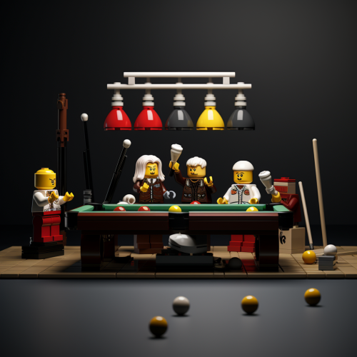 A fun combination of game characters and billiards, plain black background, lego pieces, illustration
