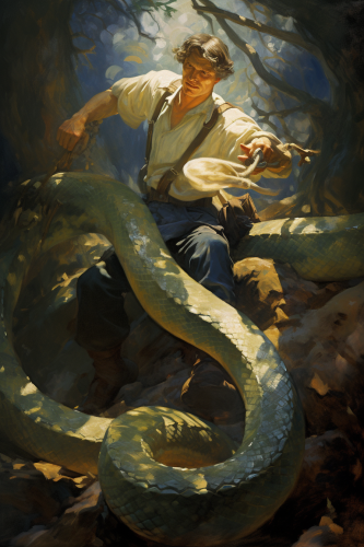 n c wyeth illustration of man with sword entangled by giant python --ar 6:9