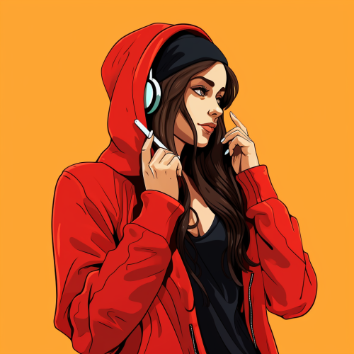 Illustration of a confident spanish girl in a cartoon style. She's dressed in a red hood sweatshirt. Paired with her hood sweatshirt are black jeans and a long black coat. She has on red, white, and black sneakers on. She's talking on her cellphone.