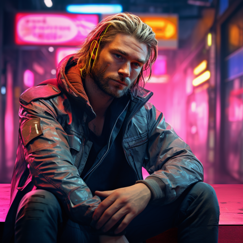 Un homme de nationnalité américaine, Ayant comme coupe de cheveux une middle part. En regardant en haut a droite. Portant une veste et un casque de réalité virtuelle, entouré de lumière néon bleue et verte en majorité , et un fond avec un peu de brume avec une ville au japon éluminer avec des led en flou. Un portrait en pied, surréaliste et hyperréaliste, dans un style esthétique cyberpunk photographique. L'image est hyperréaliste, rendue avec Octane, haute résolution, étalonnage professionnel des couleurs, ombres douces, contraste minimal. --ar 1:1