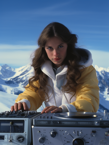 Dvd screengrab from 1982 of a female DJ with a Dj deck on top of a mountain, in the style of feminine portraiture, kodak gold 200, hasselblad 1600f, snow scenes, normcore, american barbizon school, light blue klein and white, Cinematographic, cyberpunk style. Young woman with long brown hair, strong facial features, freckles on face --ar 3:4