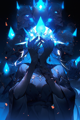 goddess with multiple arms, theatrical mask, queencore, holographic, iredecent, pearlecent, glitter, glowing white eyes, dark gray skin, black clothes, blue glow, blue aesthetic, cinematic lighting, cinematic detail, comic, anime, illustrated animation --niji 5 --ar 2:3
