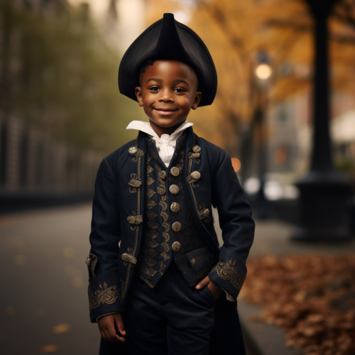 Black kid dressed in royalty clothes posing with smile, full body, in new york colonial era