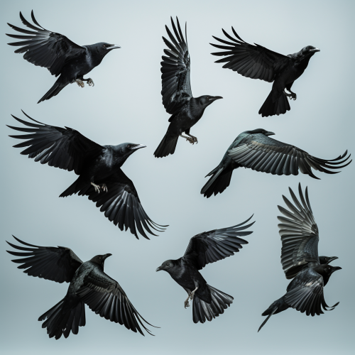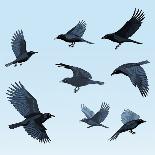 Create a series of images depicting an animation cycle of a crow in flight. Each image should be a square of the same size, capturing a different phase of the crow's wingbeat. The images should be designed so that when superposed, they form a seamless animation of the crow flying. Focus on the accuracy of the wing movement and the fluidity of the animation. Use a natural color palette for the crow, with a neutral or transparent background to facilitate overlaying. Each image should be distinct but consistent with the others to create a complete animated sequence. Properties: Square images, same size, natural color palette, neutral/transparent background.
