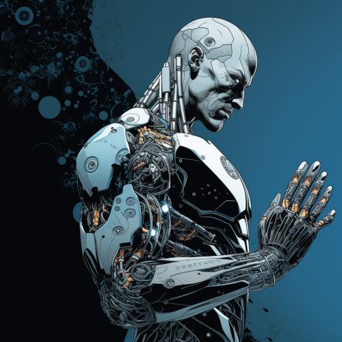 album cover. The same cyborg,, stands at the edge of a chaotic, dystopian metropolis engulfed in a storm of sound and fury. The city below is a cacophony of blaring alarms, screeching machinery, and frantic human voices, all blending into an overwhelming, oppressive noise. The environment is dark, with towering black skyscrapers piercing the red, stormy sky, illuminated by harsh, flickering neon lights. The cyborg’s expression reflects the stress and isolation, as it struggles to maintain its composure in the midst of this sensory overload. Red lightning arcs across the sky, illuminating the cyborg’s metallic form with brief flashes of white, symbolizing the inner turmoil of trying to find peace in a world that feels hostile and alien. Keywords: dystopian chaos, sensory overload, oppressive noise, dark cityscape, inner turmoil." This version emphasizes the overwhelming stress and dark atmosphere, capturing the intensity of feeling like an outsider in a chaotic world. --s 250