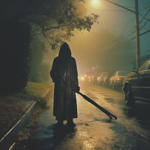 a polaroid photograph of a man wearing a hooded rain jacket holding a machete standing in a street in the suburbs, heavy rain, nightmarish, nighttime, smoke, fog, highly detailed, lots of details, low angle photo, cinematic, artistic, photographed with Polaroid camera